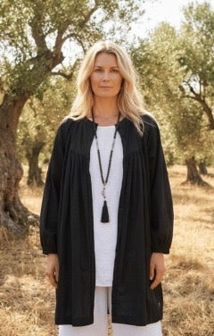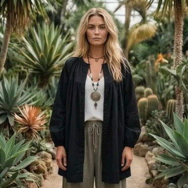 Wear it casually over linen separates for daytime ease, or glam it up with statement accessories for evening sophistication. The Jade Cotton Jacket transitions seamlessly from day to night.