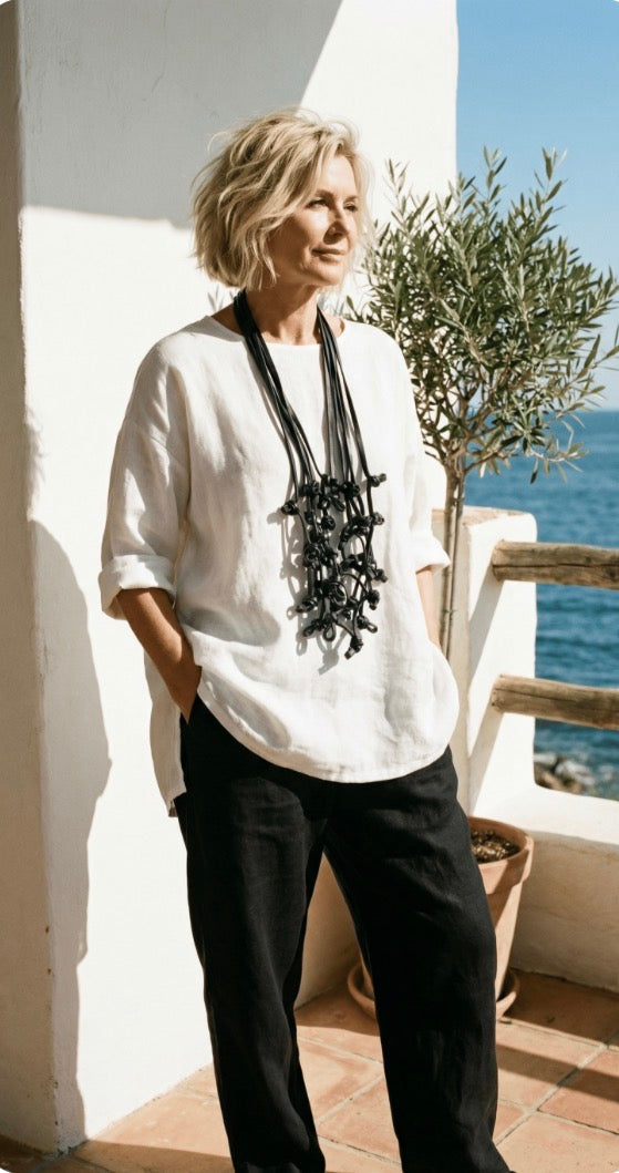 Linen is a natural, breathable fabric that softens beautifully over time. For best results, wash in cold water on a gentle cycle and air dry. See full linen care guide